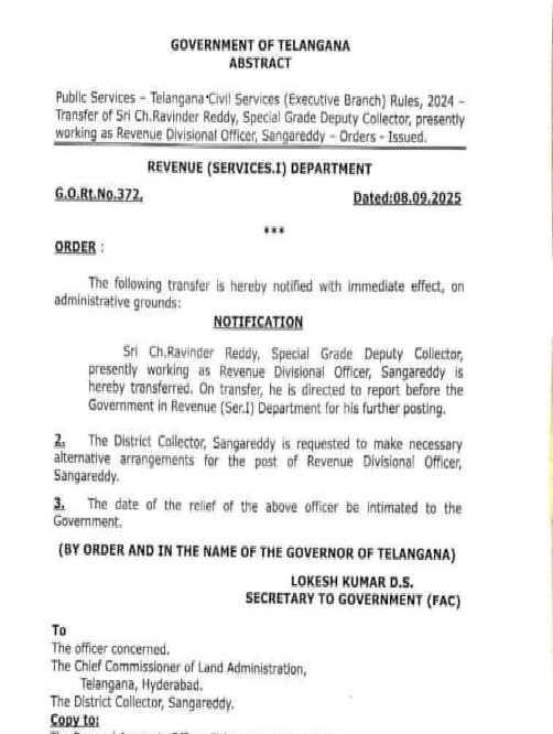 సంగారెడ్డి జిల్లా అధికార వ్యవస్థను కుదిపేసే పరిణామం వెలుగులోకి వచ్చింది. జిల్లా ఆర్డీవో రవీందర్ రెడ్డిని భూ అక్రమాల ఆరోపణలతో ప్రభుత్వం తక్షణమే బదిలీ చేసింది. సోమవారం రాష్ట్ర ప్రభుత్వ కార్యదర్శి ఉత్తర్వులు జారీ చేసి, ఆయనకు ఎటువంటి పోస్టింగ్ ఇవ్వకుండా నేరుగా ప్రభుత్వానికి రిపోర్ట్ చేయాలని ఆదేశించడం సంచలనంగా మారింది.